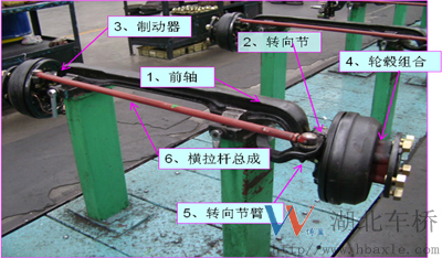 3、前橋構(gòu)造:前橋主要由前軸、主銷、轉(zhuǎn)向節(jié)、制動(dòng)器總成、輪轂組合、節(jié)臂、橫拉桿總成等組成。(如下圖)