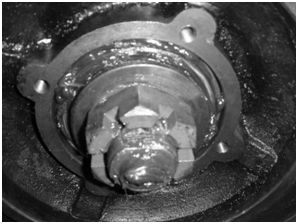 f) 使調(diào)整螺母的槽與轉(zhuǎn)向節(jié)孔對準,穿上開口銷,鎖止調(diào)整螺母。